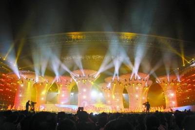 当TWINS姐妹唱起动感时尚的《八十块环游世界》时,两束超强的绿色光束,穿透舞台,射到了离舞台数百米远的观众席上,不经意间,拉近了明星、舞台与观众的距离。
