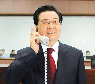 18时32分,胡锦涛走到指挥席前,拿起话筒同航天员亲切通话。
