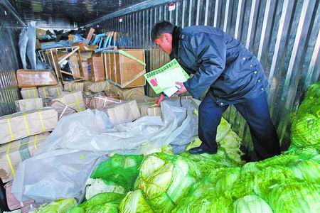 本报讯 对整车运输鲜活农产品的车辆,河南省高速公路才免收通行费。昨日,一辆只拉了少许白菜、车厢内大部分是其他货物的货车也想蒙混过关,结果被京港澳高速公路郑州圃田收费站查个正着(如图),最终,该车缴纳了335元的通行费。