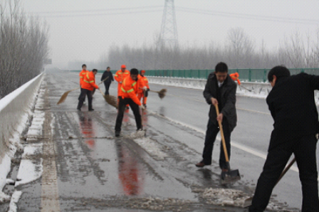 从2月28日开始,郑尧高速平顶山段全线降雪,雪量逐渐加大,桥面积雪厚度平均达到3公分,平顶山分公司在提前做好了各项除雪保通准备工作的基础上,高度重视,周密部署,迅速行动,及时处置,取得除雪保通工作的胜利,保证了郑尧高速平顶山段的安全畅通,达到了路面无结冰、无积雪。除雪期间,分公司采用“设备昼夜连续除雪、人员轮流作战”的施工方法,以最快的速度清除路面积雪。为确保超车道和紧急停车带无积雪,分公司又临时组织60余名工人及时将机械处理不干净和处理不到位的积雪清理干净、彻底。截止3月1日凌晨5点,郑尧高速平顶山段超车道、行车道机械除雪完毕,并于3月1日上午11点40分全线紧急停车带人工除雪完毕,实现了全线全部车道路面无积雪的标准。本次除雪工作,分公司共完成除雪面积200余万平方米,撒布融雪剂39吨,人工240个工日,出动设备50台班。
