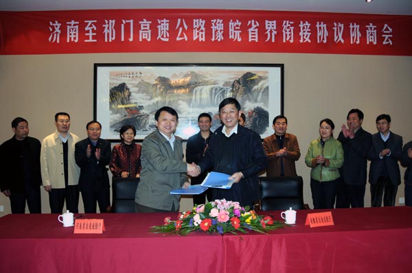 (河南省交通厅副厅长范跃武与安徽省交通厅副厅长罗宁代表两省签订了《济祁高速皖豫省界衔接协议》)