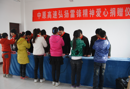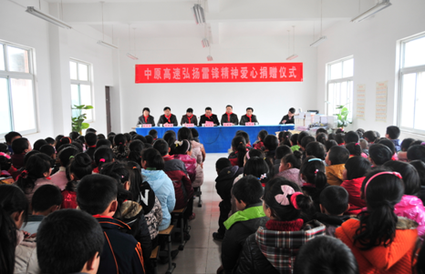 在捐赠仪式上中原高速党委书记顾光印作了讲话,他首先表达式了对西胡垌社区小学全体师生的慰问,感谢小学的各位老师对学生们的辛苦哺育。最后顾书记向同学们提几点希望:一是希望同学们努力学习雷锋精神,弘扬雷锋精神,团结友爱、助人为乐、大公无私、严肃活泼,人人争当活雷锋;二是希望同学们好好学习,天天向上,干一行爱一行。作为学生就要把学习搞好,将来成为国家的栋梁;三是希望同学们长大后,要像雷锋叔叔那样,发扬“螺丝钉”精神、“一块砖”精神,多做对社会、对人民、对国家有益的事情,让雷锋精神永放光茫!